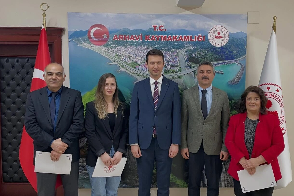 Bayram SARAYOĞLU / ARTVİN (İGFA) - Arhavi Kaymakamı Burak Çimşir'in makamında kabul ettiği kütüphaneci Kadir Öztürk, kütüphaneci Meryem İskenderoğlu ve bilgisayar işletmeni Emine Atalay’a belgeleri verilirken, özverili ve başarılı çalışmalarından dolayı başarı belgesi takdim edildi. Kaymakam Çimşir, Kütüphane Müdürü Metin Aksoy’unda hazır bulunduğu ziyarette, kütüphane personeline çalışmalarından dolayı teşekkür ederek çalışmalarında kolaylıklar diledi.