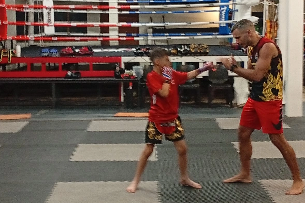 İZMİR (İGFA) - Bostanlıspor antrenörü, aynı zamanda babası Aytaç Uyanıker ile Tayland’ın Phuket Adası’nın Patong kentinde günde toplam 5 saat 2 olmak üzere haftada 35 saatlik antrenman programının yanı sıra yine her gün 3 kilometrelik dağ koşusu bulunan 1 aylık Singpatong Muay Thai kampı’na katılan Bostanlıspor'un 10 yaşındaki muay thai sporcusu Mert Uyanıker, ilk kez ringe çıktı.