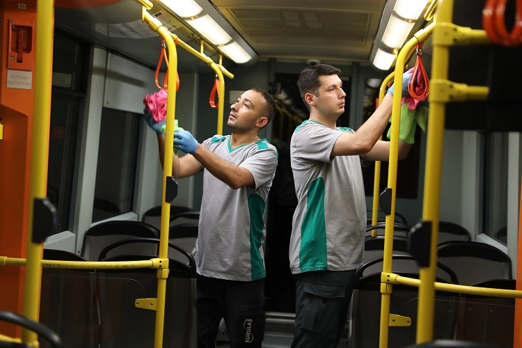 BURSA (İGFA) - Bursa’nın en önemli konularından biri olan ulaşımı rahatlatmak ve konforu artırmak amacıyla yeni projeleri hayata geçiren Büyükşehir Belediyesi, BURULAŞ bünyesindeki toplu taşıma araçlarında hijyeni en üst seviyeye çıkarmak için temizlik çalışmalarını periyodik olarak yürütüyor. Günlük sefer yapan trenlerin genel temizlikleri düzenli bir şekilde yapılırken, hijyen kalitesinin artırılması amacıyla her gün 4 tren detaylı temizlik işlemine tabi tutuluyor. Aylık ortalama 120 trenin detaylı temizliği yapılıyor.