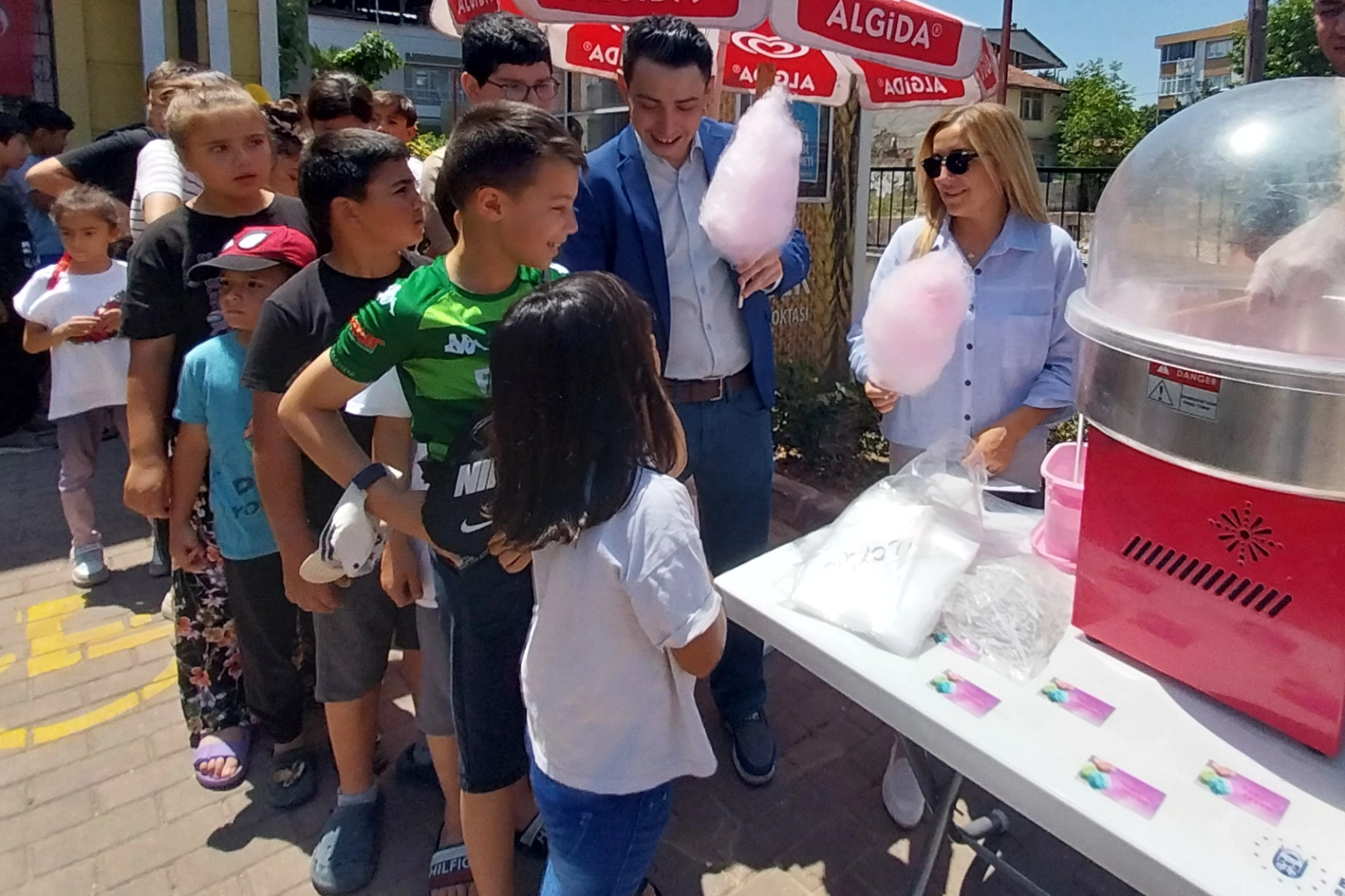 Bursa’nın sevilen isimlerinden ve örnek vatandaşlarından Onur Çetin, karne heyecanı yaşayan çocukları mutlu etmek için anlamlı bir sürprize imza attı. Çetin, yaz tatiline giren miniklere karne hediyesi olarak pamuk şeker dağıttı.