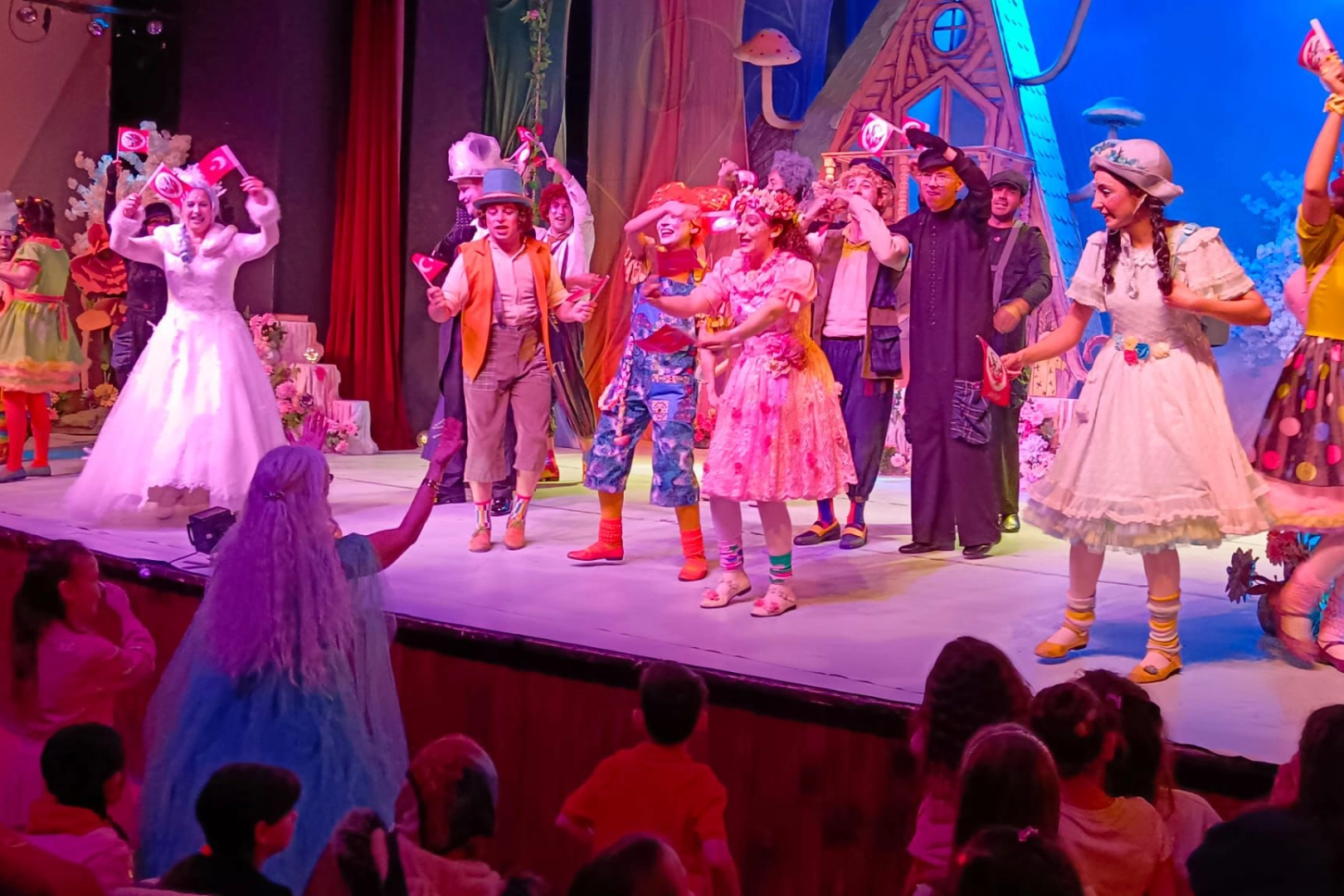 Oyunun sonunda oyuncular sahneden inerek çocuk seyircilerle bir araya geldi.
