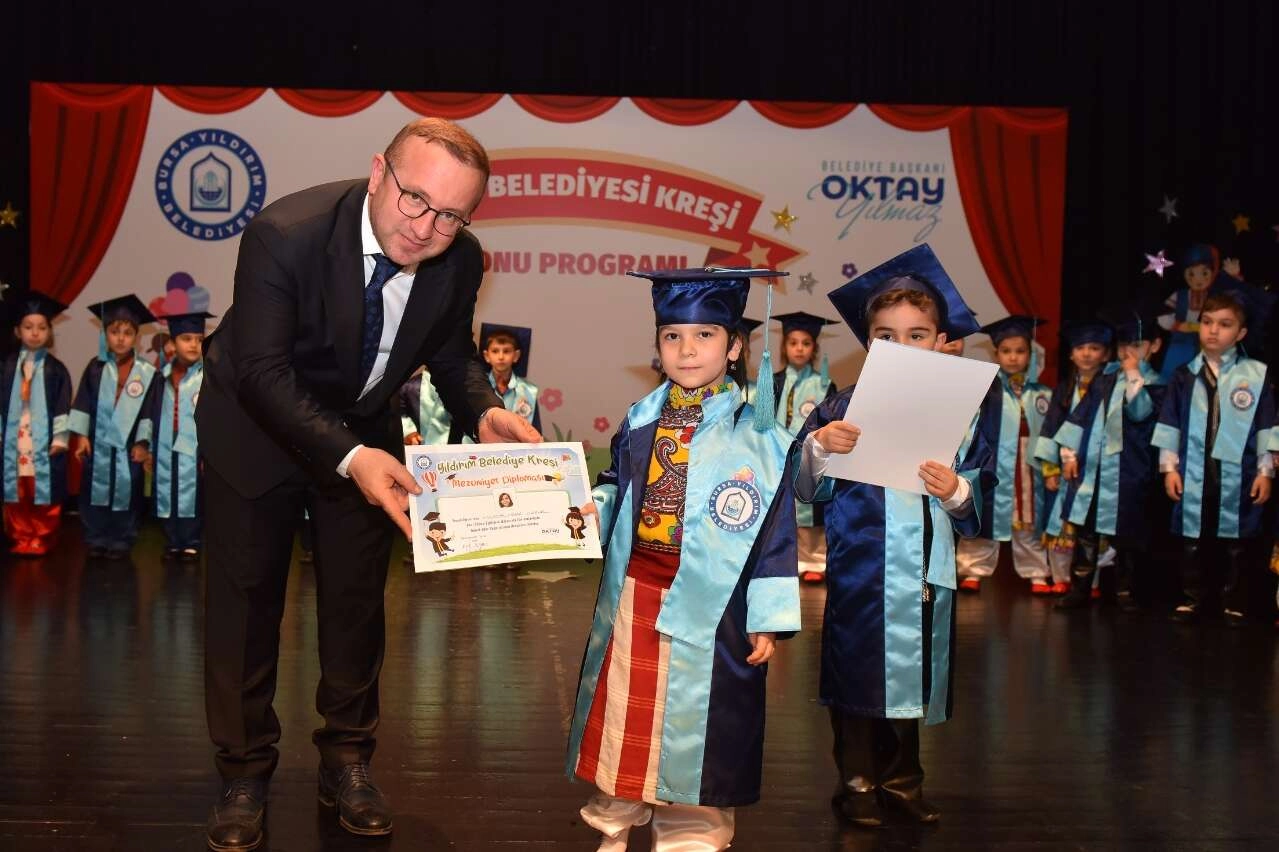Hizmet önceliklerinin gençler ve çocuklardan oluştuğunu belirten Yıldırım Belediye Başkanı Oktay Yılmaz, “3 yıl boyunca kreşimizde eğitim gören 32 yavrumuzu mezun ediyoruz. Bizlere bu gururu yaşatan çocuklarımıza teşekkür ediyorum. Çocuklarımız burada çok şey kazandı. İnşallah kreşimizdeki kazanımlarını, bundan sonra daha ileriye taşıyacaklar. Bu süreçte çocuklarımıza annelik yapan öğretmenlerimize ve yöneticilerimize teşekkür ediyorum. İnşallah bugün kreşten mezun ettiğimiz çocuklarımızın üniversite mezuniyetine de şahitlik ederiz” dedi.