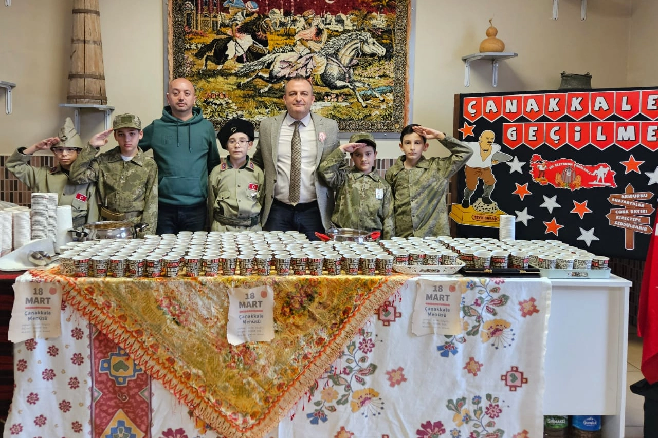 Çanakkale Savaşları sırasında askerlere verilen yemek menüsü hakkında öğrencilere bilgi verildi. O günlerde üzüm hoşafı ve bir dilim ekmekle beslenen askerlerimizin şartlarını daha iyi kavrayabilmeleri için, asker kıyafeti giyen öğrenciler arkadaşlarına aynı menüyü ikram etti.