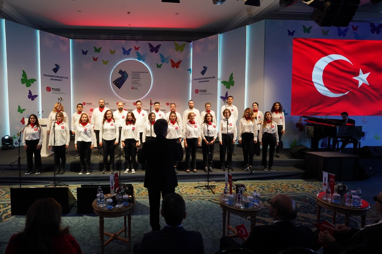 ANKARA (İGFA) - Sözleri Göksel Altınışık Ergur ve Ali Ergur'a, bestesi TGSD’nin geçmiş dönem başkanlarından Ali Mahmut Abra'ya ait olan "Yüzyılın Çağrısı" adlı eser, önce TGSD üyeleri ve üye firmaların çalışanlarının oluşturduğu TGSD Korosu, ardından da opera sanatçısı Güvenç Dağüstün tarafından seslendirildi.