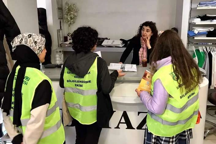 Etkinlik kapsamında Silivri Belediyesi İklim Değişikliği ve Sıfır Atık Müdürlüğü'nden çevre mühendisleri ve Rumeli Üniversitesi öğrencileri, vatandaşları ve esnafları ziyaret ederek sıfır atık konusunda bilgiler veriyor.