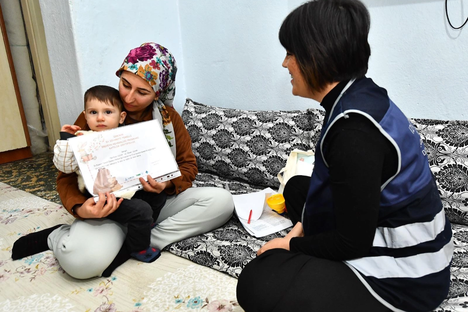 “0-12 Ay Ev Ziyareti Temelli Ebeveyn Rehberliği Programı” kapsamında gebeliğin 7. ayından itibaren İzmirli anneler evlerinde ziyaret ediliyor. Bebek bekleyen kadınlarla birebir iletişim kuran Büyükşehir ekipleri, doğumun ardından bir ay boyunca hemşire eşliğinde emzirme eğitimleri için de ziyaretler gerçekleştiriyor. Çocuk 1 yaşına gelene kadar 27 kez yapılan ev ziyaretlerinde çocuğun bilişsel gelişimi için oyunlar oynanıyor, ebeveyn ve çocuk arasındaki iletişim güçlendiriliyor. 12 aya adım atan İzmirli minikler, “İzmir95 Ev Ziyareti Temelli Ebeveyn Rehberliği Programı Katılım Sertifikası” ile hayatlarındaki ilk diplomalarını da almış oluyor.