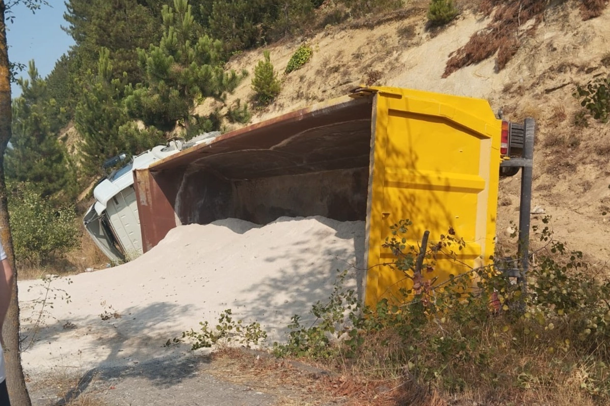 DÜZCE (İGFA) - Yerleşim alanı ve diğer araçların bulunduğu bölgede kontrolü kaybeden sürücü, ani bir kararla direksiyonu dağ tarafına çevirerek kamyonun devrilmesini sağladı. Devrilme sonucu kamyonun kasasındaki kum yola saçıldı.