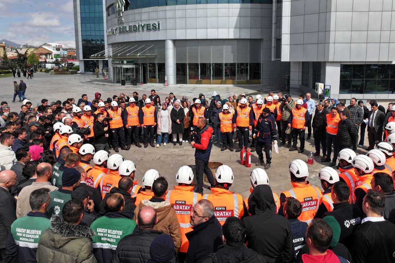 Belediye çalışanlarının afetlere karşı bilinçlenmesi ve olası acil durumlara hazırlıklı olması amacıyla gerçekleştirilen teorik eğitim, uygulamalı tatbikatlarla desteklendi. Eğitim, AFAD Arama Kurtarma Birim Şefi Serdar Gencer tarafından verildi. Eğitim kapsamında ilk olarak afet farkındalığı ve yangına müdahale konularında, Karatay Belediyesi Afet İşleri Müdürlüğü tarafından özel olarak kurulan arama kurtarma ekibine yönelik sunumlar gerçekleştirildi.