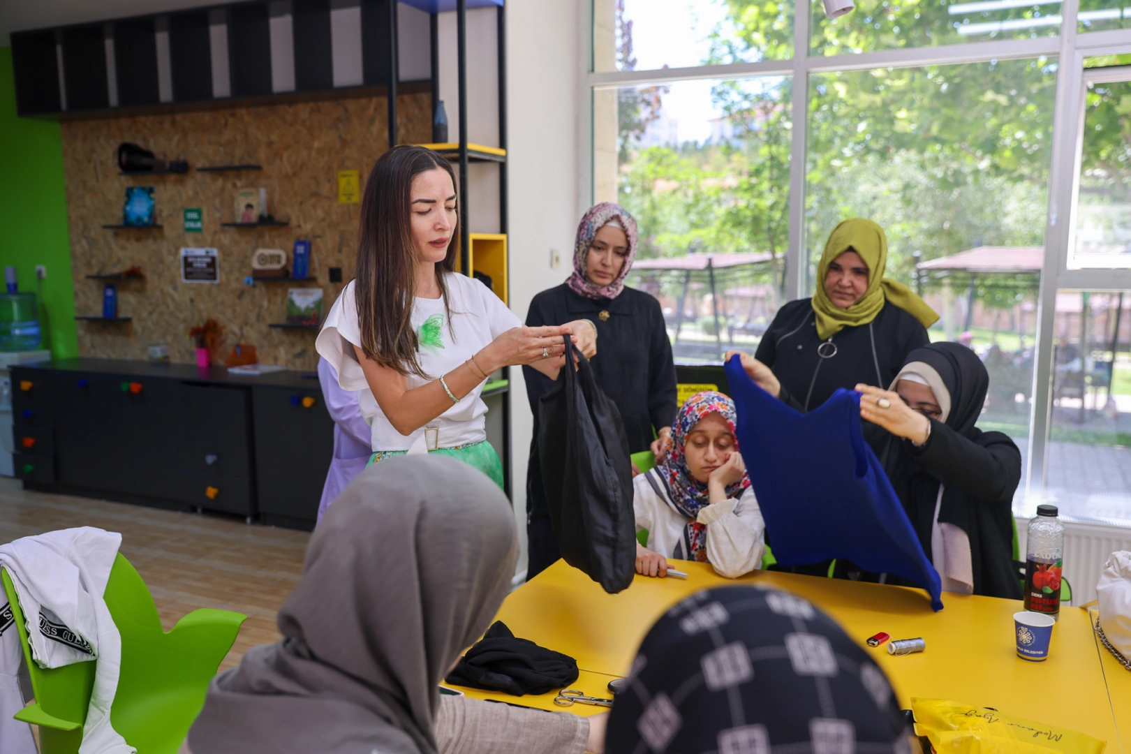 Yeşil Atölye’de düzenlenen etkinliğe Diyanet Konya Genç Ofis Yaz Akademisi öğrencileri de katıldı. Etkinlikte kullanılmayan eski tişörtlerden birbirinden renkli onlarca bez çanta üretildi.