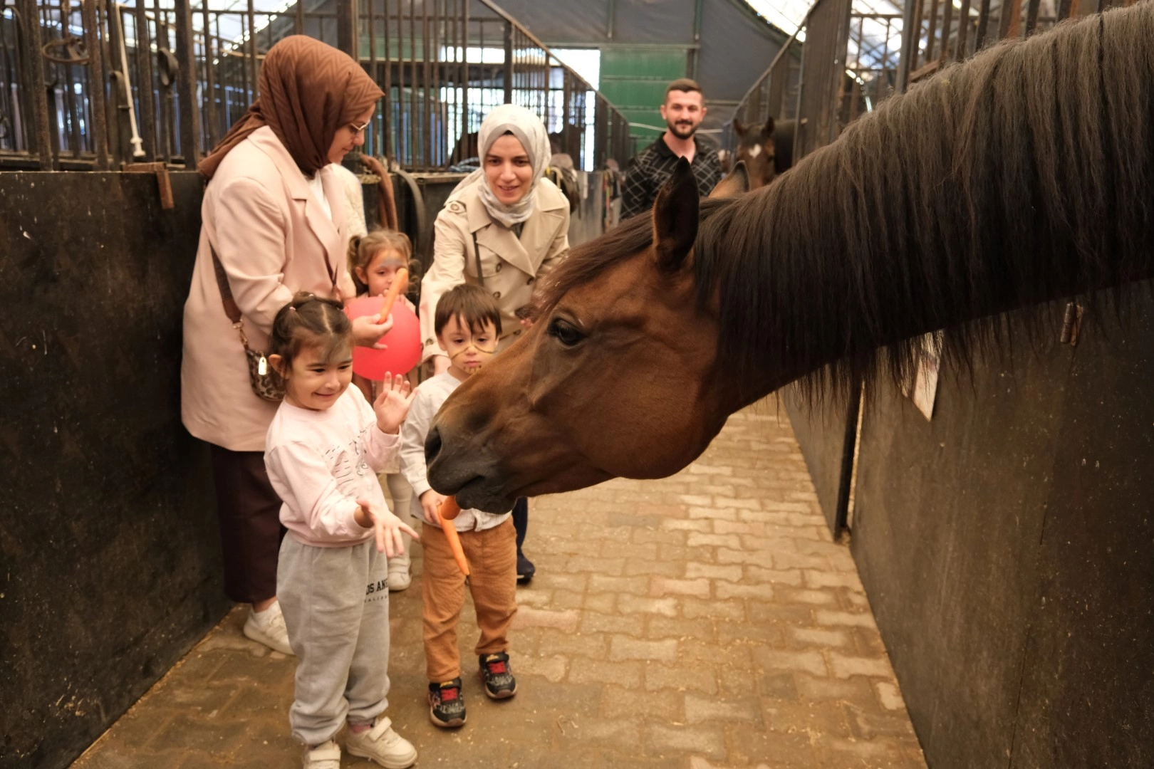Çocuklar, etkinliğe öğretmenleriyle birlikte geldi. İlk olarak görevlilerden atların yaşamı, bakımı ve ihtiyaçları hakkında bilgi alan öğrenciler daha sonra ahırlara geçti. Burada yanlarında getirdikleri havuçları atlara veren minik öğrenciler, atları severek onlarla fotoğraf çektirdi.
