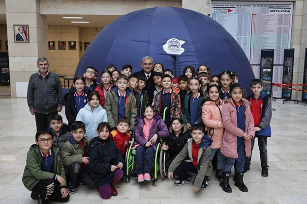 VR gözlük deneyimin ardından yine Belediye Hizmet Binamızdaki Fuaye Alanına kurulan ve öğrencilere güneş sistemini anlatan planetaryumu ziyaret eden Başkanımız Işık, çocukların heyecanına ortak oldu.