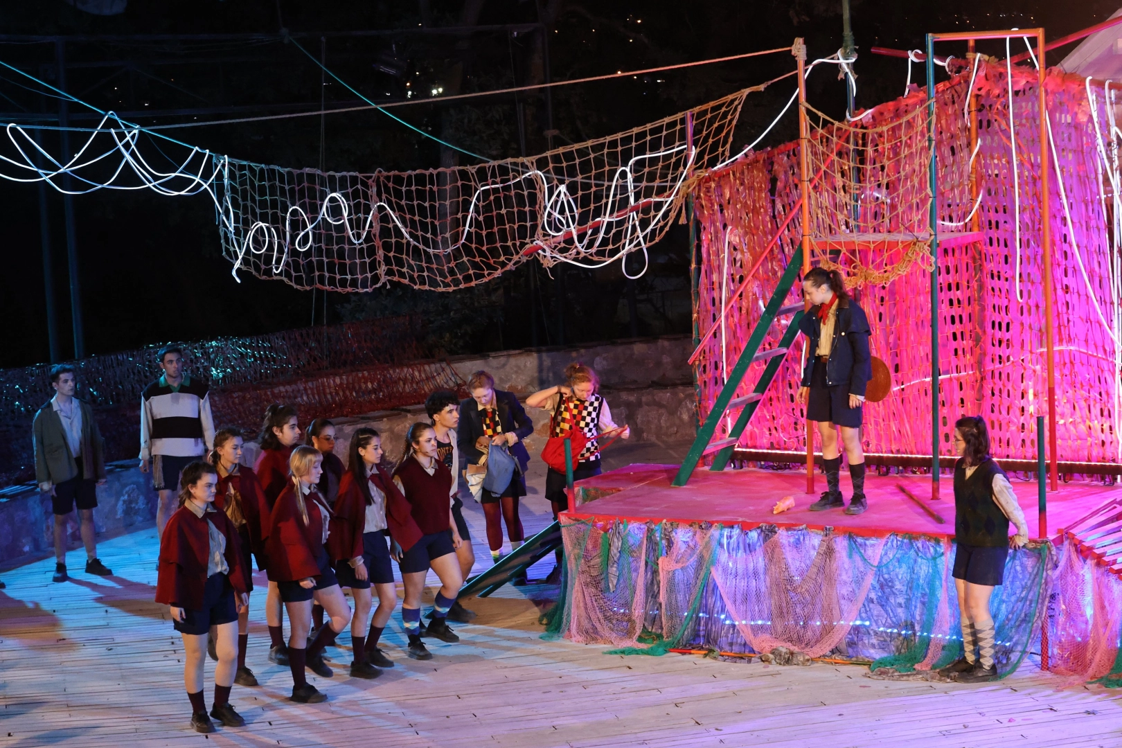 Ocak ayından bu yana süren yoğun eğitim sürecinin ardından sahneye çıkan genç oyuncular, uçak kazası sonucu ıssız bir adaya düşen çocukların uygarlıktan uzak kaldıkça içlerindeki ilkel dürtülerle yüzleşmelerini konu alan oyunu etkileyici bir performansla sundu.
