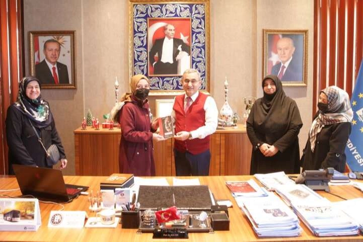 KÜTAHYA (İGFA)- Kütahya Belediye Başkanı Prof. Dr. Alim Işık’ı makamında ziyaret eden Anadolu Gençlik Derneği Kadın Kolları Başkanı Serpil Sunar ve Üniversite Komisyon Başkanı Zehra Yıldırım, aile okulu ve kültürel faaliyetler hakkında bilgi verdiler.
