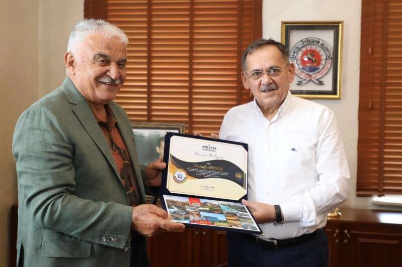 Dr. Ömer Yıldız, Avrasya Üniversitesi olarak ulaşımda akıllı çözümler ve çevreci belediyecilik alanında yürütülen çalışmalar nedeniyle Samsun Büyükşehir Belediye Başkanı Mustafa Demir’e ‘Başarı Belgesi’ takdim etti. Büyükşehir Belediye Başkanı Mustafa Demir de hem başarı belgesi hem de ziyaretleri nedeniyle Dr. Yıldız ve beraberindeki heyete teşekkür etti.