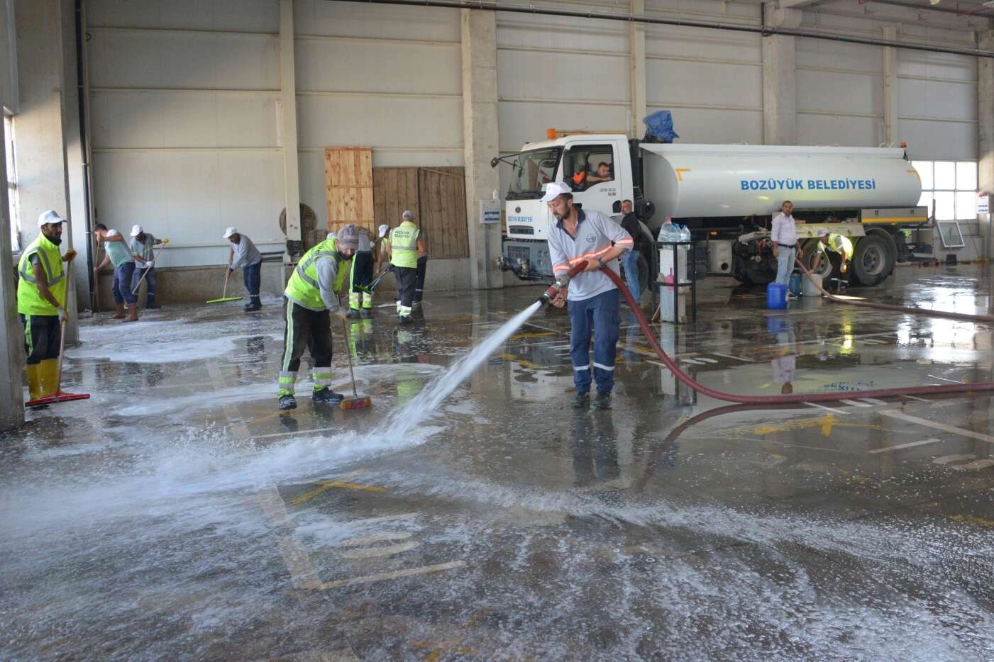 Bozüyük Belediyesi Temizlik İşleri Müdürlüğü ekipleri pazar içerisinde tezgâhlar kaldırılarak mazgallar temizlerken, süpürge aracı ile süpürge yapılıyor ve deterjan ile köpürtülerek yıkanan pazarda vatandaşların alışverişlerini hijyenik bir ortamda yapmaları sağlanıyor.