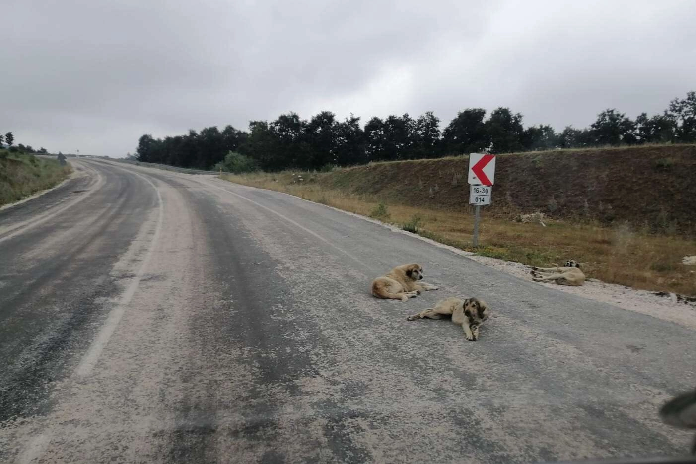 Karayolunda hızla seyir halindeki araçların etrafını saran ve yol ortasında yatan köpekler sürücüler için tehlike saçmaya devam ediyor.
