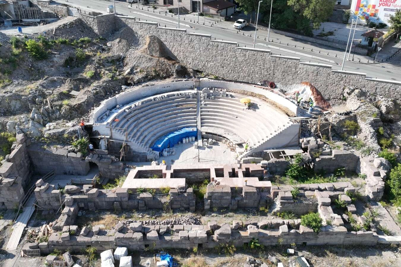 Cumhuriyet’in 100’üncü yılında Başkent turizmine kazandırılması hedeflenen tiyatroda basamak yerleştirme çalışmaları gerçekleştiriliyor.