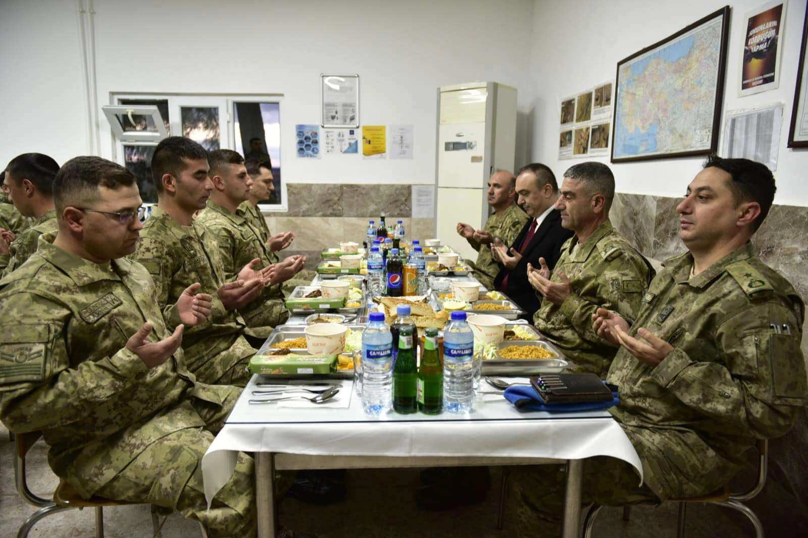KİLİS (İGFA)- Kilis Valisi Recep Soytürk, Akçabağlar Mevkiindeki ara hat yolundaki incelemelerinin ardından Süngütepe Karakolunda 5 Zırhlı Tugay Komutanı Tuğgeneral Hacı Halil Osma ve 1.Hudut Alay Komutanı Albay Halil Sıddık Ayhan ile birlikte Mehmetçikle beraber iftar yaptılar.