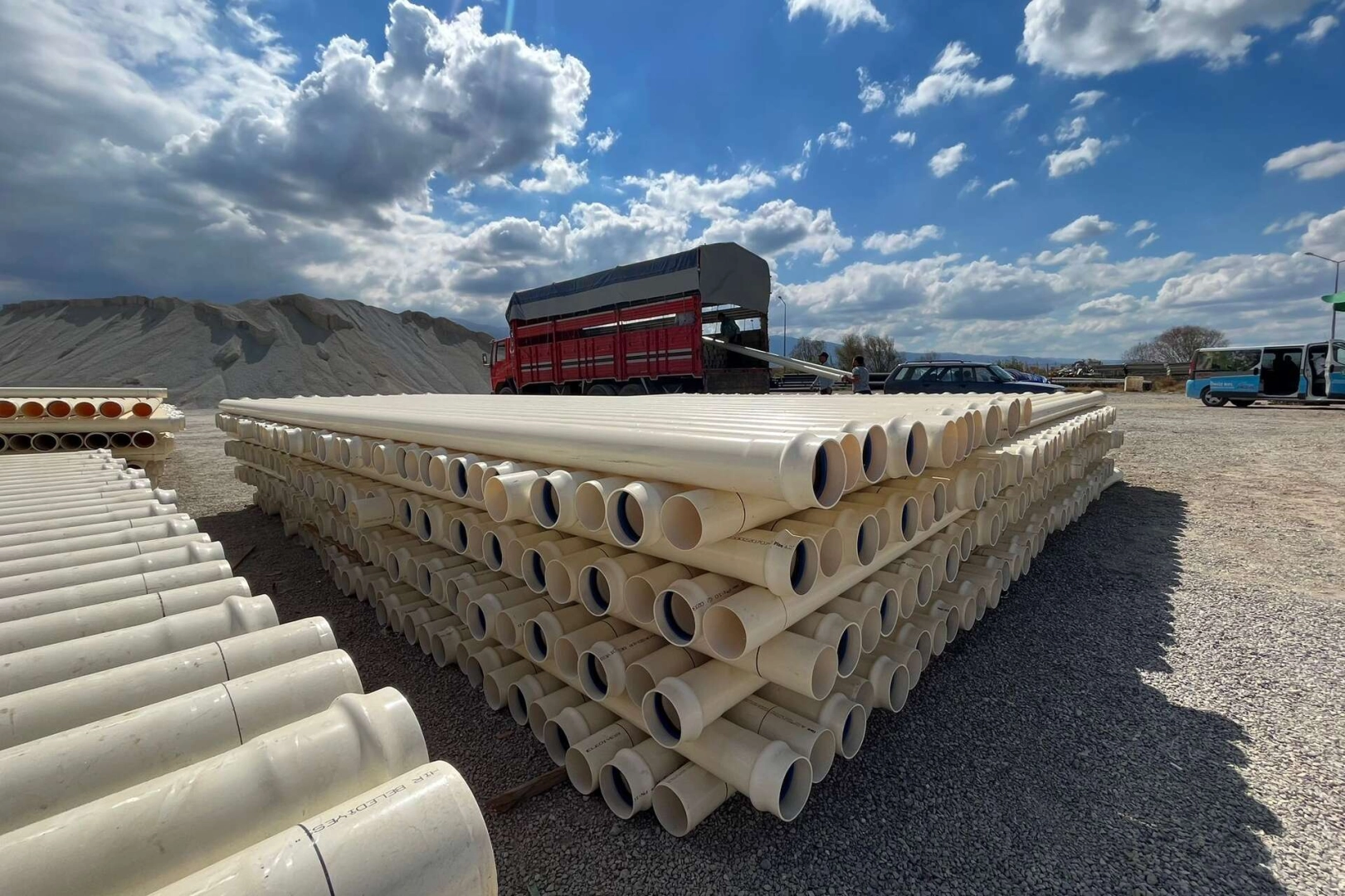 Kırsal Hizmetler Dairesi Başkanlığı ekipleri tarafından kooperatif başkanları ve temsilcileri, şantiye alanına davet edilerek, temin edilen borular teslim ediliyor.