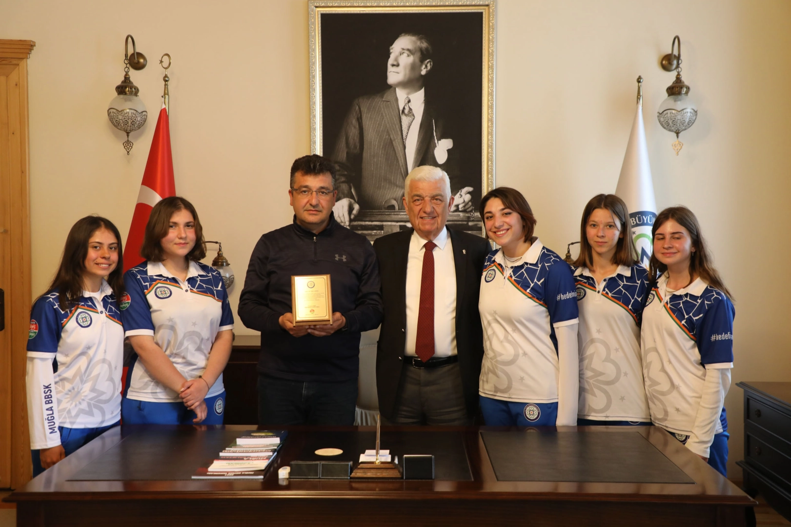 MUĞLA (İGFA)- Muğla Büyükşehir Belediyesinin şampiyon okçuları Büyükşehir belediye Başkanı Dr. Osman Gürün’ü ziyaret etti. Ziyarette antrenör Ejder Sözen, okçular Hazal Burun, Ceyda Kömür, Meltem Kaya, Gülçin Balık, Ece Su Demircan hazır bulundu. Okçuluk Milli Takım Kampında bulunan Emircan Haney ve Songül Lök ziyarette yer alamadı.