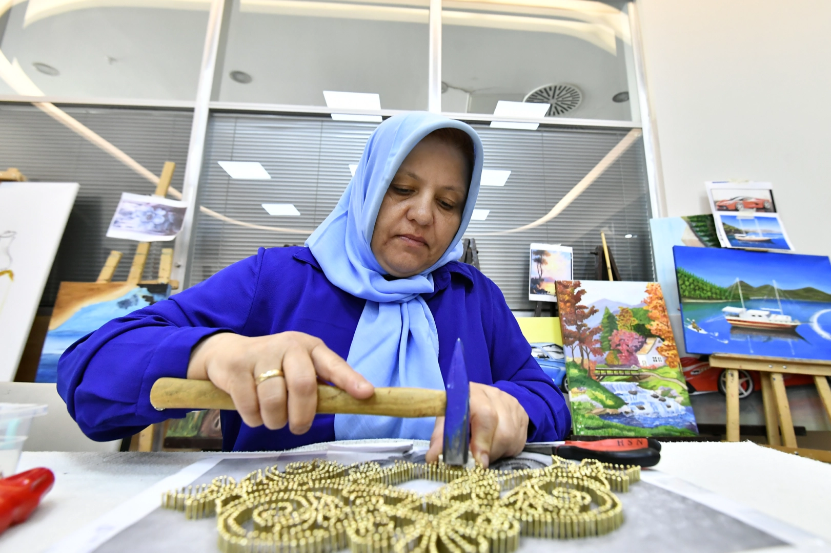 BURSA İGFA- Osmangazi Belediyesi’nin Halk Eğitim Merkezi işbirliğiyle ücretsiz olarak düzenlediği OSMEK Kursları, meslek sahibi olmayan vatandaşları çalışma hayatına kazandırıyor. Demirtaş Kültür Merkezi’nde verilen filografi eğitimlerinde kursiyerler; çivi çakma, tel tutma, tel örme ve desen çıkarmanın inceliklerini öğreniyor. Toplam 24 öğrencinin olduğu kursta, üniversite öğrencilerinden ev hanımlarına, emeklilerden çalışana kadar her yaş grubundan kursiyer bulunuyor. Bu sanatın tüm inceliklerini kavrayan kadınlar, sabırla örülen tellerden şaheserler ortaya çıkartıyor.