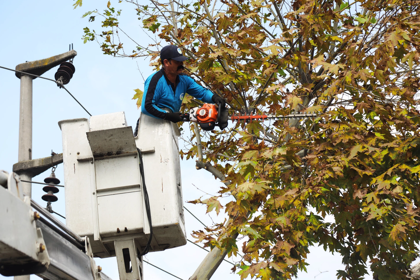 Sonbahar mevsimine girilmesiyle birlikte park ve caddelerde başlatılan budama çalışmaları, çevre güvenliği alınarak özel ekipmanlarla yapılıyor.