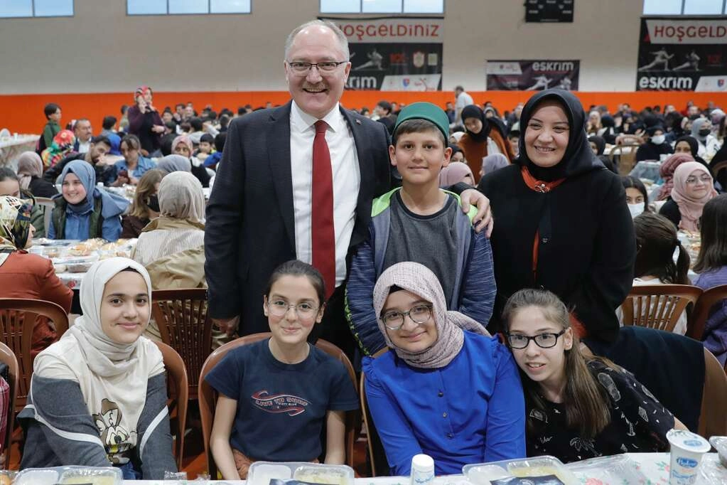 Okulun spor salonunda düzen programda yaklaşık 1000 öğrenci ve aileleri ile birlikte iftar sofrasında bir araya gelen Bilgin, masaları tek tek dolaşarak katılımlarının Ramazan ayını tebrik etti. İftarın ardından konuşan Başkan Hilmi Bilgin, “Okulumuz 6/A sınıfı öğrencilerimizden ‘Başkanım bizi iftara götürür müsünüz’ diye bir teklif gelmişti. Biz de bu iftarı sadece bir sınıfımızla değil, okulumuzda öğrenim gören tüm öğretmen, öğrencilerimiz ve ailelerimizle birlikte yapalım, iftarın bereketini muhabbetini birlikte paylaşalım dedik. Muhabbet sofrasında sizlerle bir araya geldik” dedi.