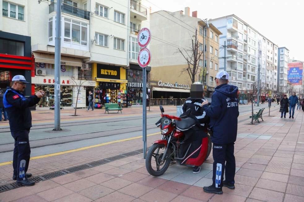 ESKİŞEHİR (İGFA) - Büyükşehir Belediyesi Zabıta Trafik Ekipleri motorlu taşıt trafiğine kapatılan ve araç geçişinin yasaklandığı bölgelere giriş yapanlara karşı denetimlerine ara vermeden devam ediyor. UKOME kararıyla her türlü motorlu taşıtlara girişi yasaklanan İki Eylül Caddesi ve İsmet İnönü Caddesi’ne giriş yapan motosiklet, elektrikli bisiklet ve scooter sürücülerine yaya güvenliğini tehlikeye düşürdükleri için Encümen’e sevk edilmek üzere idari yaptırım kararı uygulandı.