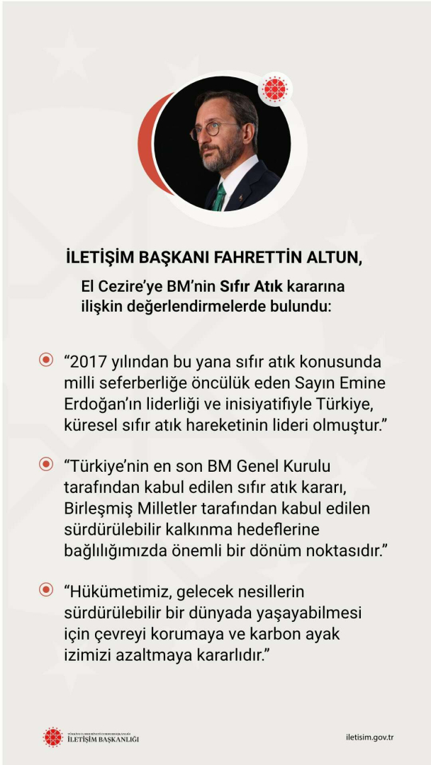 Cumhurbaşkanlığı İletişim Başkanı Fahrettin Altun, Türkiye'nin "Sıfır Atık Projesi"nin Birleşmiş Milletler Genel Kurulunca (BMGK) kabul edilmesine ilişkin yaptığı değerlendirmede, hükümetin gelecek nesillerin sürdürülebilir bir dünyada yaşayabilmesi için karbon ayak izimizi azaltmaya kararlı olduğunun altını çizdi.