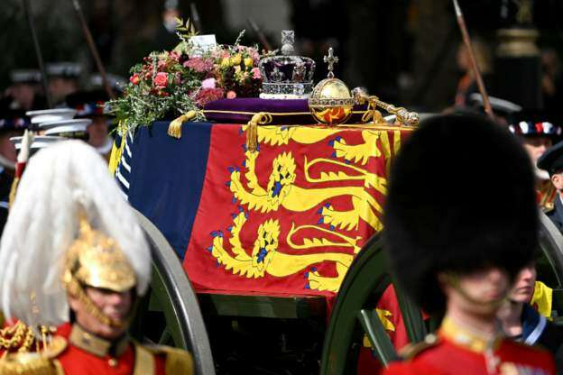 Kraliçe'nin Krlaiyet Sancağı'na sarılı tabutunun üzerinde İmparatorluk Tacı, Hükümdar'ın altın küresi ve asası bulunuyor.