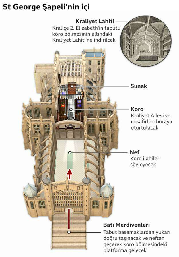Kraliçe'nin naaşı St George Şapeli'nde başlayacak defin servisi için Windsor Kalesi'ne naklediliyor.