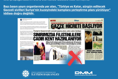 Bazı basın yayın organlarında yer alan, “Türkiye ve Katar’ın sürgün edilecek Gazzeli sivilleri Suriye’nin kuzeyindeki kamplara yerleştirme planı yaptığı” iddiası gerçeği yansıtmadığı bildirildi.