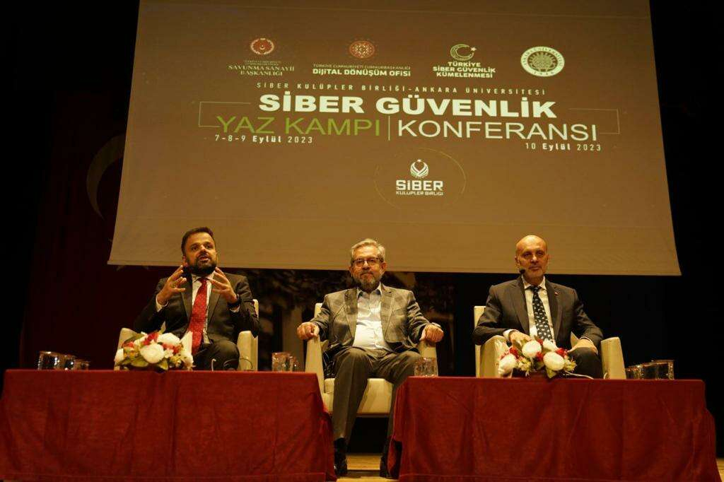 “Siber Güvenlik Yaz Kampı”nın son gününde, Cumhurbaşkanlığı Dijital Dönüşüm Ofisi Başkanı Dr. Ali Taha Koç, Ankara Üniversitesi Rektörü Prof. Dr. Necdet Ünüvar ve Cumhurbaşkanlığı Savunma Sanayii Başkan Yardımcısı Mustafa Murat Şeker’in katılımıyla Dil ve Tarih-Coğrafya Fakültesi Farabi Salonu’nda “Gelecek Nesil İçin Siber Güvenlik Vizyonu” temalı konferans düzenlendi.