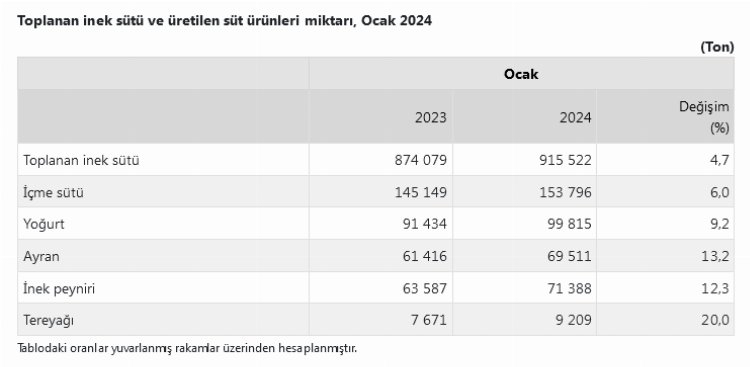 Ocak ayında bir önceki yılın aynı ayına göre, inek peyniri üretimi yüzde 12,3, ayran üretimi yüzde 13,2, yoğurt üretimi yüzde 9,2, içme sütü üretimi yüzde 6,0, tereyağı üretimi yüzde 20,0 arttı.
