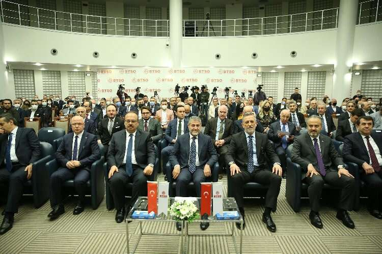Bursa Valisi Yakup Canbolat, Büyükşehir Belediye Başkanı Alinur Aktaş, BTSO Başkanı İbrahim Burkay ile birlikte çok sayıda iş dünyası temsilcilerinin hazır bulunduğu "Bursa İş Dünyası Buluşması" toplantısında önemli açıklamalarda bulunan Bakan Dr. Nureddin Nebati, son haftalarda birçok uluslararası kuruluşun büyüme rakamlarını düşürdüğünü ifade ederek, salgın döneminde dünyada ihracatta 225 milyar doları aşan tarihi bir rakama ulaştık. Mart ayında da geçtiğimiz yıla oranla yüzde 22 oranında arttığını söyledi.