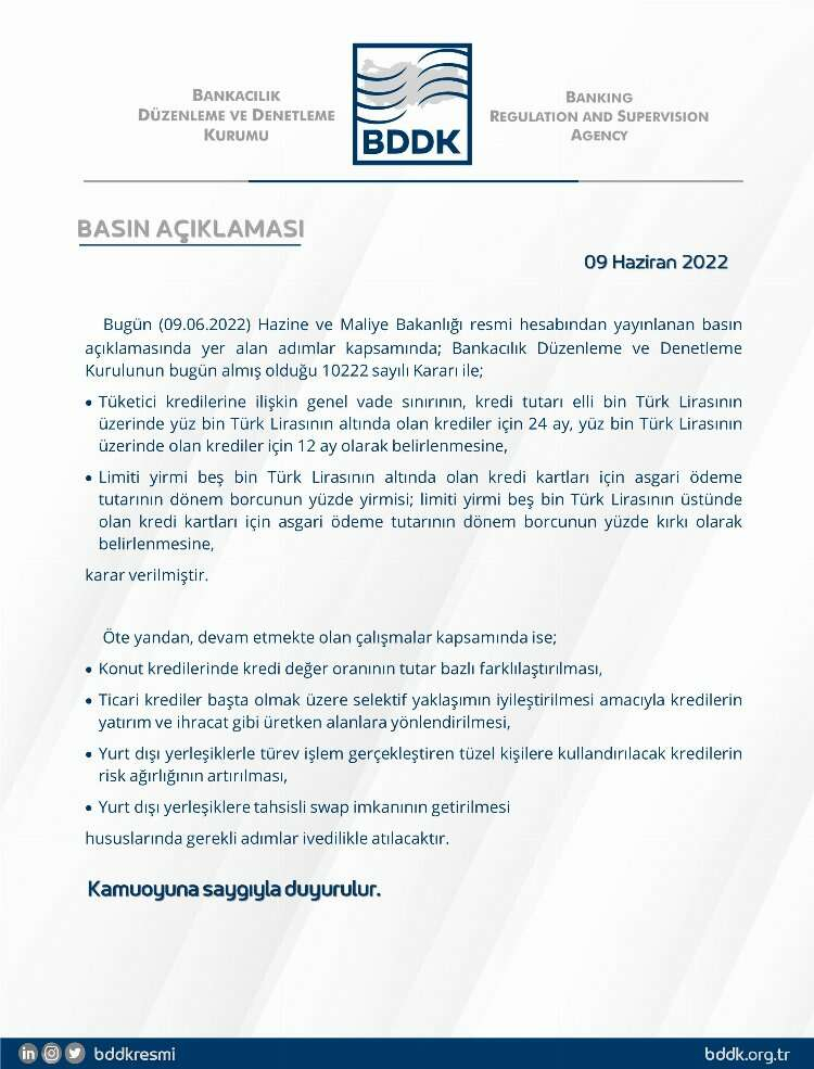 Hatırlanacağı gibi daha önce BDDK, 50 bin TL üzeri tüketici kredilerinde vade sınırını 36 aydan 24 aya indirmişti. .