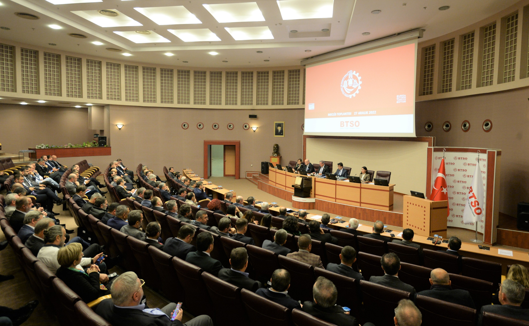 Yılın son meclis toplantısında 2022’deki faaliyetler ve yeni yıl için hedeflenen çalışmalar değerlendirildi. BTSO Yönetim Kurulu Başkanı İbrahim Burkay, küresel ekonominin en zor yıllarından biri olarak kabul edilen 2022’nin sonlarına yaklaştıklarını belirterek, “Tüm dünyada yüksek enflasyonun belirlediği koşullarla tamamlanan bu olağanüstü yılın ardından 2023’e ümitlerimizi tazeleyerek giriyoruz. Ülkemizin idealleri açısından 2023 yılı önemli bir kilometre taşı. Cumhuriyetimizin 100. yılını kutlayacağımız 2023’te bizler de bugüne kadar olduğu gibi 52 bini aşkın üyemizle birlik ve dayanışma içerisinde kentimize değer katan çalışmalarımızı sürdüreceğiz.” dedi.