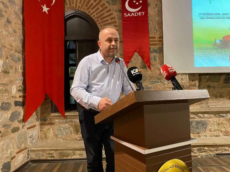 Konferansın açılış konuşmasını yapan Saadet Partisi Bursa İl Başkanı Mehmet Atmaca, “Düzenlemiş olduğumuz bu programa hepiniz hoş geldiniz. Tarım deyince Milli Görüş hareketinin tarımla ilgili duruşunu, bakışını herkes biliyor. Biz de bu konuya verdiğimiz önemden dolayı böyle bir program düzenlemeyi düşündük. Çünkü son dönemde ciddi anlamda tarımla ilgili sıkıntılar yaşandığını hepimiz biliyoruz. Sıkıntılar birçok yönde yaşanıyor. Milli Görüş Hareketi eskiden beri ülkemizin coğrafi yapısı gereği güçlü bir Türkiye’nin inşası için çalışmıştır. Türkiye’de tarımda kendi kendine yetebilecek bir ülke olma potansiyelinde olduğu için bu konuya önem vermiştir ve hep gündeminde tutmuştur. İktidara gelinen kısa dönemlerde tarım ve hayvancılıkta ciddi desteklerini verdiğini hepimiz biliyoruz. Bu münasebetle biz tarıma ve hayvancılığa önem veren bir hareketiz. Özellikle bizim kalkınmamıza en büyük katkı sağlayacak sektörlerden biri olduğunu düşünüyoruz. Çünkü altyapı ve coğrafyamız buna çok uygun. Yatırım maliyeti ve bu yatırımın geriye dönüşme süreci çok kısa olduğu için. Özellikle içinde bulunduğumuz ve ekonomik sıkıntıyı aşmamız için en kolay yollarından biri olduğunu düşünüyoruz. Etraflıca bazı sorunlar da var. Bunların başında hızlı kentleşme, çarpık yapılaşma sonucu maalesef heba edilen tarım arazileri, Bursa’mız için son derece önemli bir sorun. Hepimiz üzülüyoruz. Tarım ve gıda temel ihtiyaçtır. Bu münasebetle ilerleyen süreçlerde bu konuya önem verilmesini arzu ediyoruz. Örneğin önderlik yapabileceğimiz birçok üründe sırf kotalardan ötürü üretim yapamıyoruz. Sahip olduğumuz bu coğrafi zenginliklerin farkına varır, hem tarımda kendi kendine yeten ülke olur hem de tarımla elde edilecek gelirlerle diğer ihtiyaçların karşılanmasında kaynak sağlamış oluruz” şeklinde konuştu.