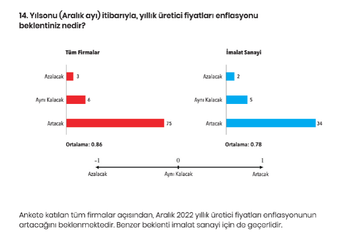 Ankete katılan tüm firmalar, önümüzdeki dönemde satış fiyatlarının artacağını beklemektedir. Firmaların yıl sonu üretici fiyatlarının artacağı yönündeki beklentisi, yüksek enflasyon konjonktürünün süreceğini düşündüklerini ortaya koymaktadır. Anket, firmaların artan girdi ve işçi maliyeti ve yükselen kur ve enflasyona rağmen üretime dönük büyüme umudunu koruduklarını da göstermektedir.