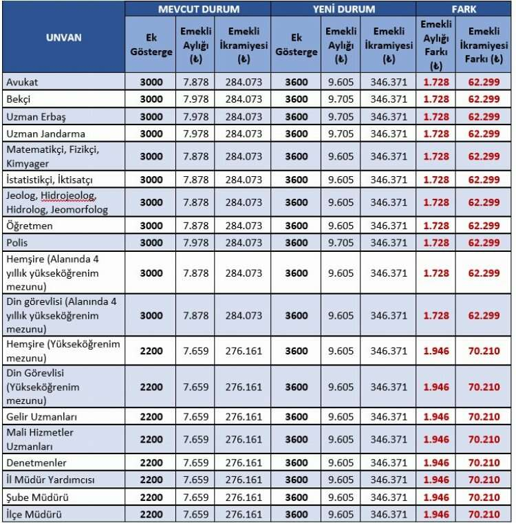 Düzenleme kapsamında 2022 Temmuz ayı itibariyle ek göstergesi 3000’den 3600’e çıkan ve 30 yıllık hizmeti olan birinci derecedeki bir memurun; emekli aylığında 1.728 TL, emekli ikramiyesinde ise 62.299 TL artış olacak. Örneğin; Temmuz ayı itibariyle birinci derecedeki 3000 ek göstergeli öğretmen, sağlık çalışanı, din görevlisi, avukat ve matematikçi gibi unvanlarda görev yapanların emekli aylığı 7.878 TL’den 9.605 TL’ye çıkacak, emekli ikramiyesi ise 284.073 TL’den 346.371 TL’ye çıkacak. Polisler de söz konusu bu artıştan yararlanacak ve ek ödemeleri ile birlikte emekli aylıkları 7.978 TL’den 9.705 TL’ye, emekli ikramiyeleri ise 284.073 TL’den 346.371 TL’ye yükselecek. Ek göstergesi 2200’den 3600’e yükseltilen sağlık çalışanları, din görevlileri, denetmen ve şube müdürü gibi memurların ise emekli aylıklarında 1.946 TL ve ikramiyelerinde 70.210 TL ilave ödeme olacak. Bu kapsamda bu kişilerin emekli aylıkları 7.659 TL’den 9.605 TL’ye, emekli ikramiyeleri ise 276.161 TL’den 346.371 TL’ye yükselecek.