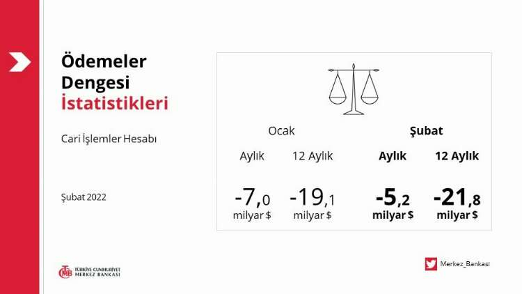 Merkez Bankası tarafından açıklanan ödemeler dengesi verilerine göre, cari işlemler açığı Şubat'ta geçen yılın aynı ayına kıyasla 2 milyar 707 milyon dolar artarak 5 milyar 154 milyon dolar düzeyinde gerçekleşti. Bunun sonucunda 12 aylık cari işlemler açığı 21 milyar 845 milyon dolara yükseldi.
