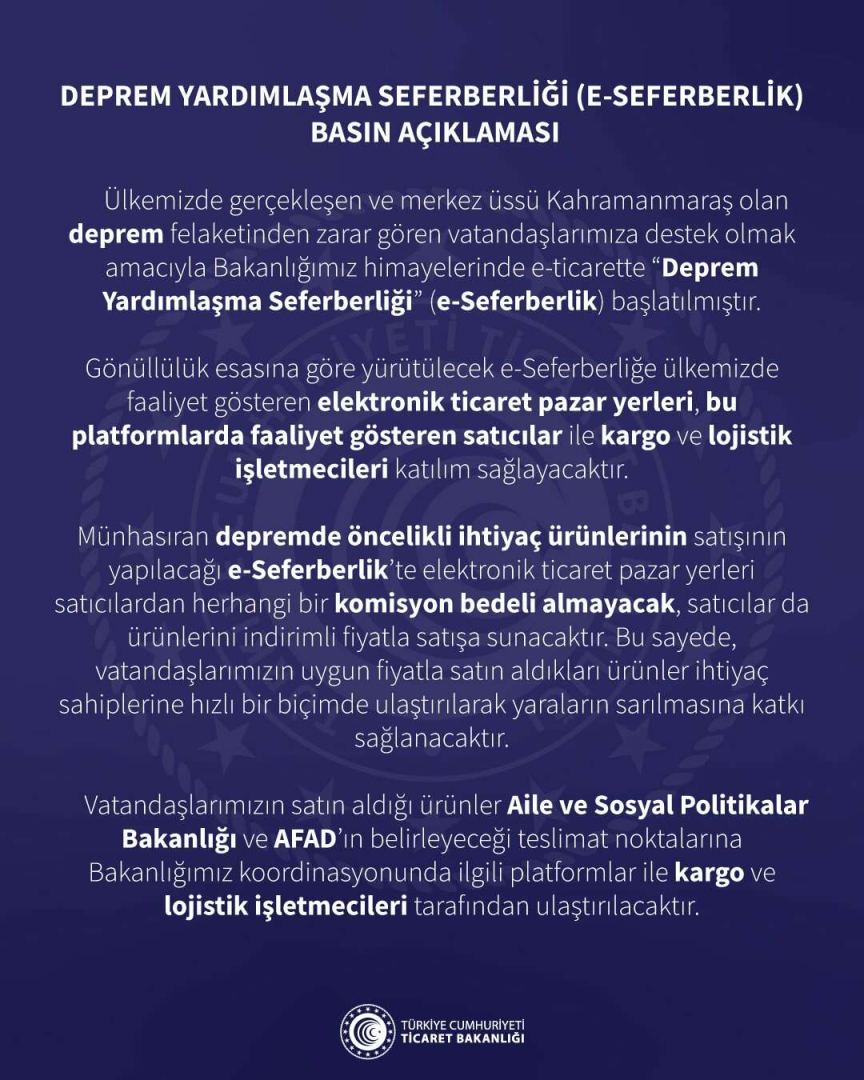 Ticaret Bakanlığı himayesinde, depremden zarar gören vatandaşların öncelikli ihtiyaç ürünlerinin satılacağı e-Ticarette Deprem Yardımlaşma Seferberliği (e-Seferberlik) başlatıldı.
