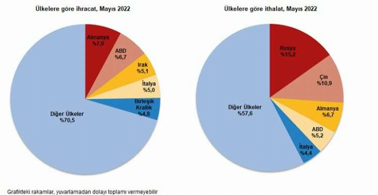 Mayıs ayında ihracatta ilk sırayı Almanya aldı. Almanya'ya yapılan ihracat 1 milyar 492 milyon dolar olurken, bu ülkeyi sırasıyla; 1 milyar 273 milyon dolar ile ABD, 978 milyon dolar ile Irak, 953 milyon dolar ile İtalya, 911 milyon dolar ile Birleşik Krallık takip etti. İlk 5 ülkeye yapılan ihracat, toplam ihracatın yüzde 29,5'ini oluşturdu.