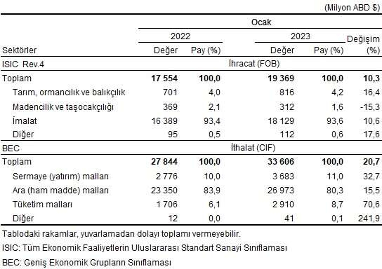 Ocak'ta ihracat bir önceki yılın aynı ayına göre yüzde 10,3 artarak 19,4 milyar dolar, ithalat ise yüzde 20,7 artarak 33,6 milyar dolar olarak gerçekleşti.