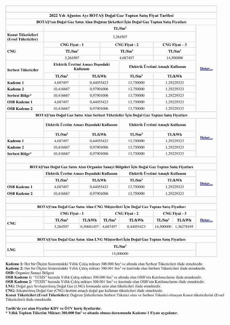 Doğalgazda ağustos tarifesi, BOTAŞ tarafından yayımlandı. Elektrik üretim amaçlı tarifede yüzde 10'luk artış yapılırken konut ve sanayi abonelerinin tarifelerinde değişiklik olmadı.