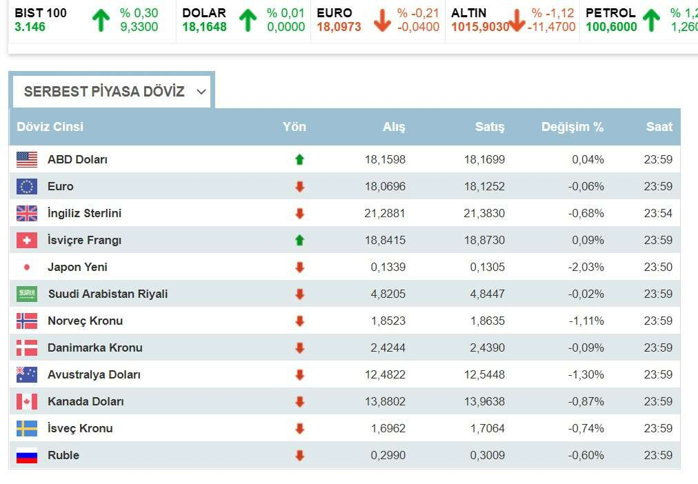 Dolar, serbes piyasada alış 18.15, satış 18.16 olurken, euro ise alış 18.06, satış 18.12 oldu.