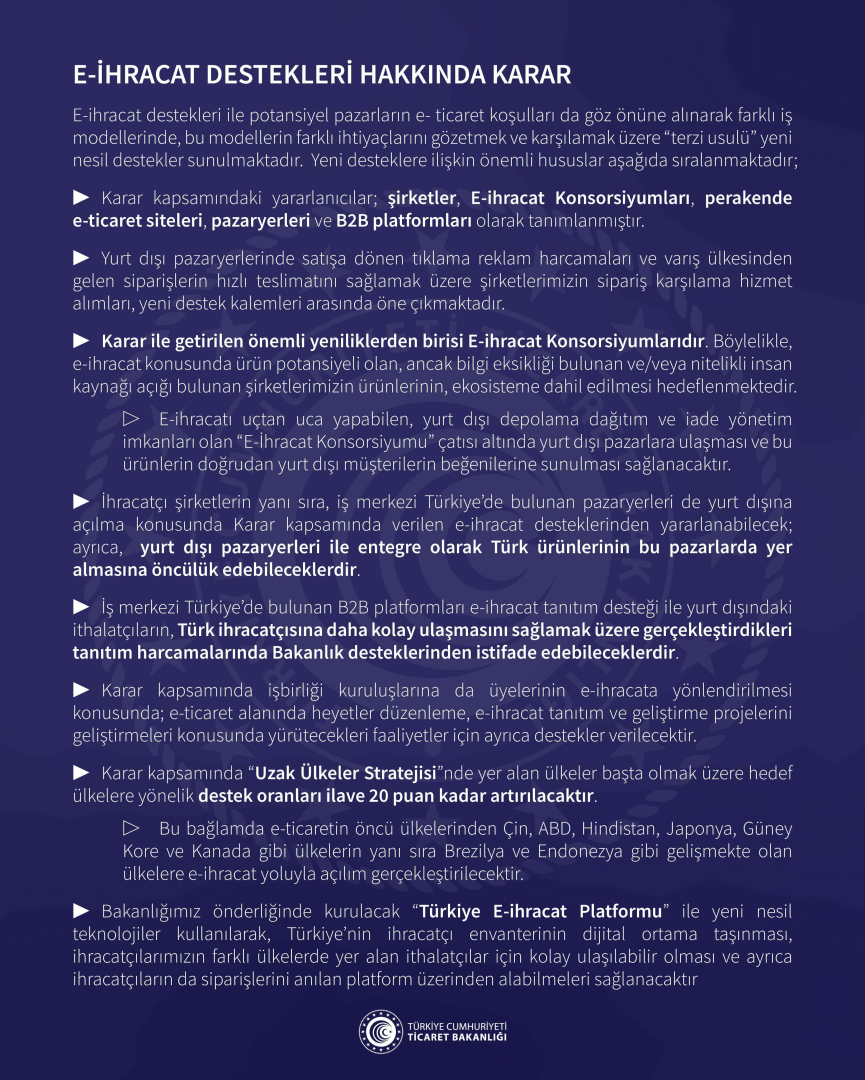 Günümüzün gelişen koşullarında hızla artan e-ticaret ve e-ihracatın payının artması için desteklenmesine karar verildi. e-ihracat destekleri hakkındaki karar bugünkü Resmi Gazete'de Cumhurbaşkanı Recep Tayyip Erdoğan imzasıyla yayımlandı.