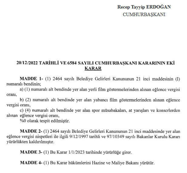 Resmi Gazete'de yayımlanan Cumhurbaşkanı Kararı ile film gösterimleri, spor müsabakaları, at yarışları ve konserlerden alınan eğlence vergisi yüzde sıfır olarak belirlendi.