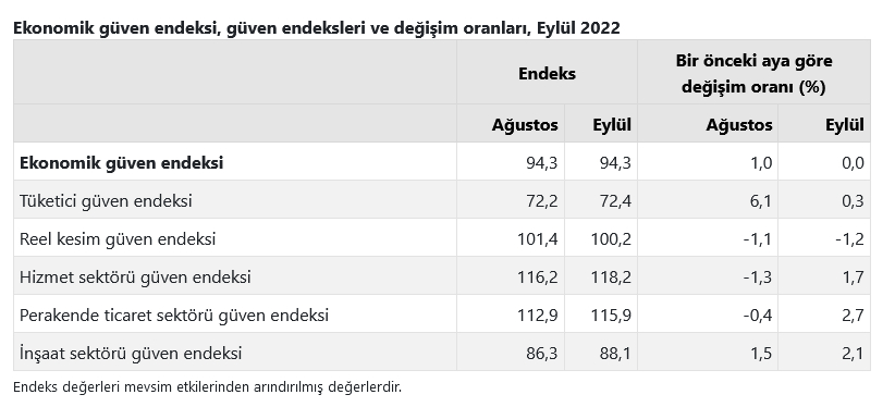 Bir önceki aya göre Eylül ayında tüketici güven endeksi yüzde 0,3 oranında artarak 72,4 değerini, hizmet sektörü güven endeksi yüzde 1,7 oranında artarak 118,2 değerini, perakende ticaret sektörü güven endeksi yüzde 2,7 oranında artarak 115,9 değerini, inşaat sektörü güven endeksi yüzde 2,1 oranında artarak 88,1 değerini aldı.