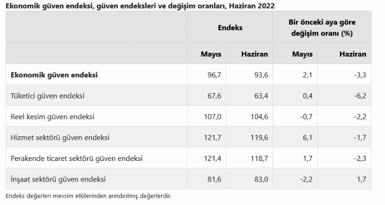 TÜİK'in açıkladığı Haziran ayı ekonomik güven endeski verilerinde endeks yüzde 3,3 azaldı.